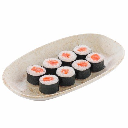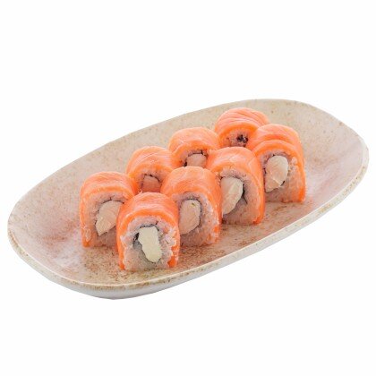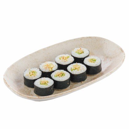 Ролл с авокадо и креветками со сливочным сыром, свежими огурцами, с подачей соуса терияки и кунжута