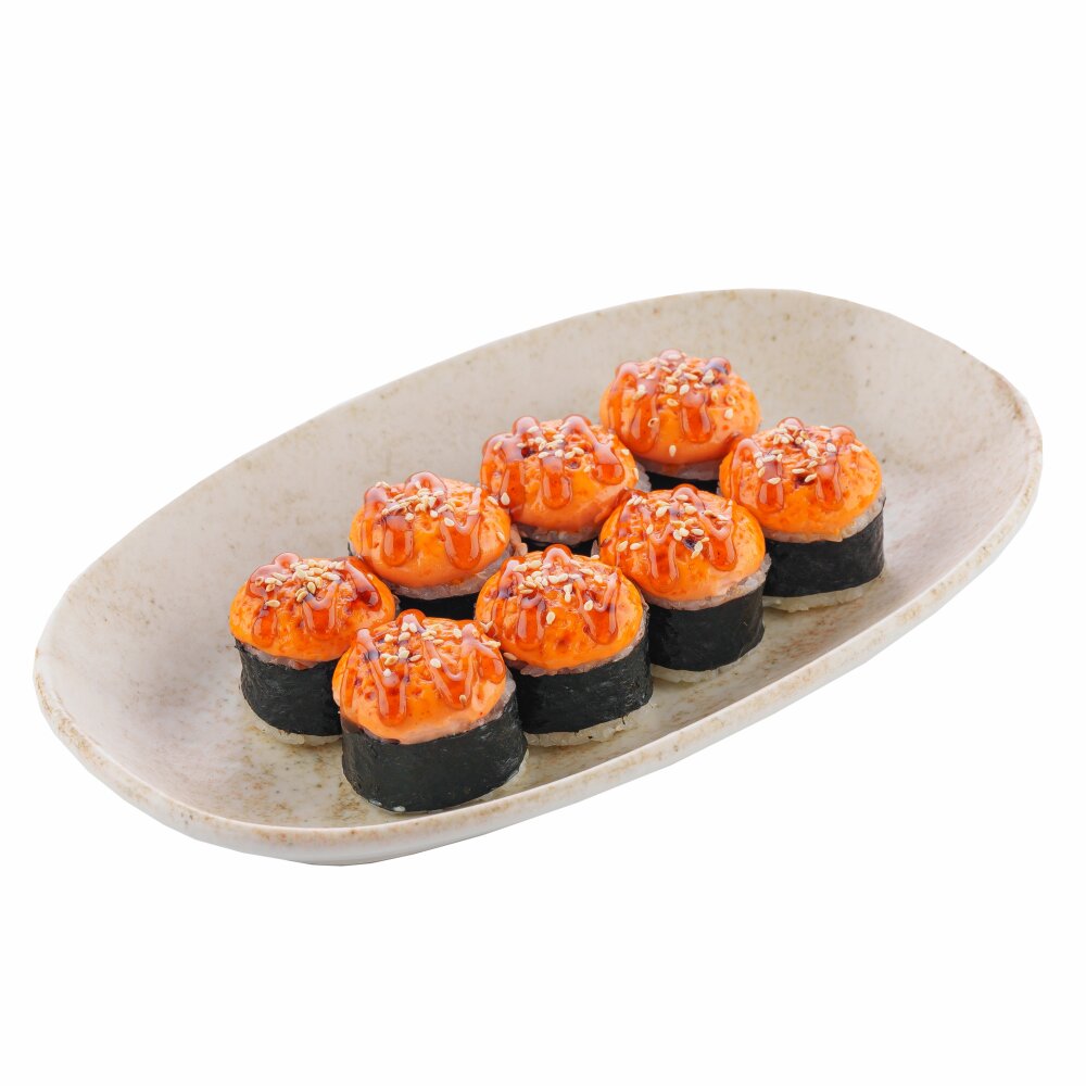Запеченный ролл креветки, огурцы, сливочный сыр, майонез тобико соус, унаги соус