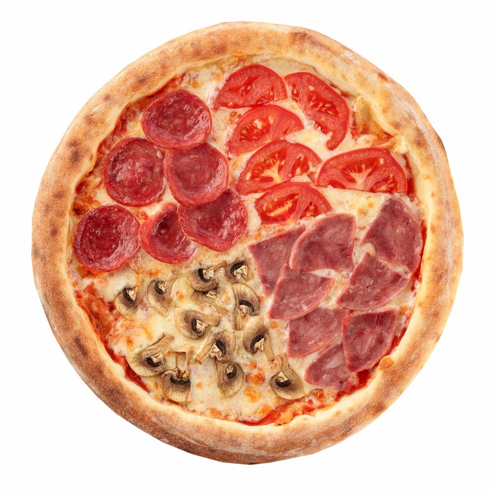 Колбаса, ветчина, грибы шампиньоны, помидоры, сыр моцарелла