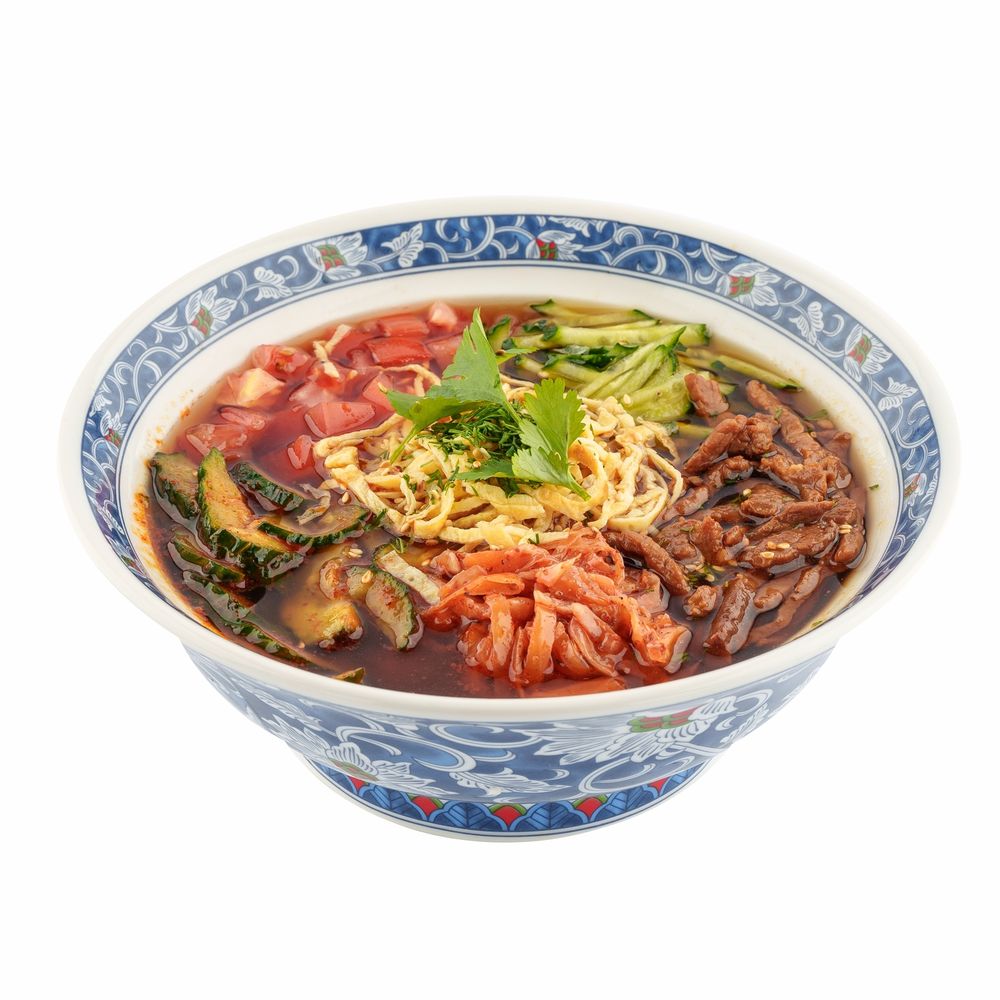 Тонкая лапша, огурцы, помидоры, говядина, бульон, капуста, блины, укроп, кунжут