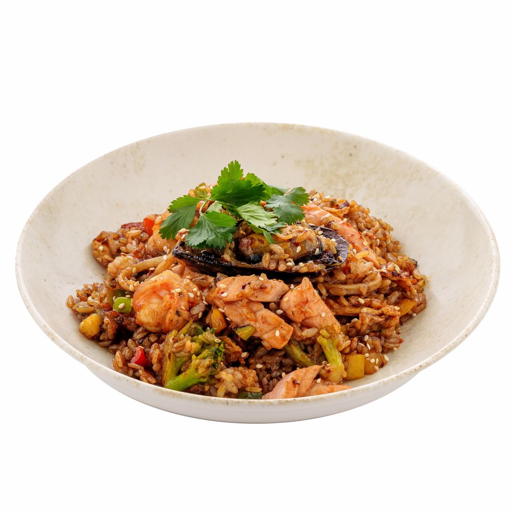 Рис, болгарский перец, лук репчатый, брокколи, ростки сои, яйцо, соевый соус, рыбный соус, морепродукты