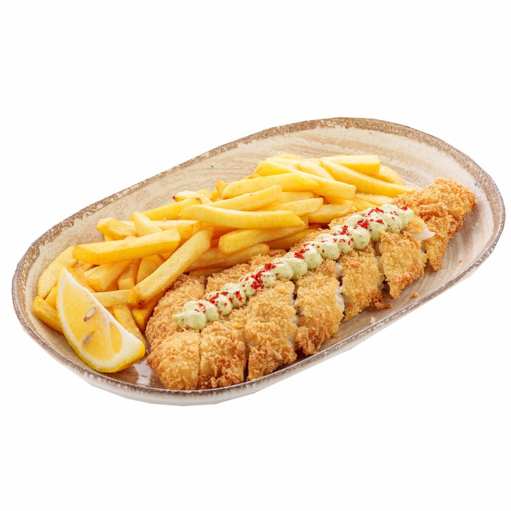 Филе судака обжаренное в кляре, подается вместе с картофелем фри и соусом тартар