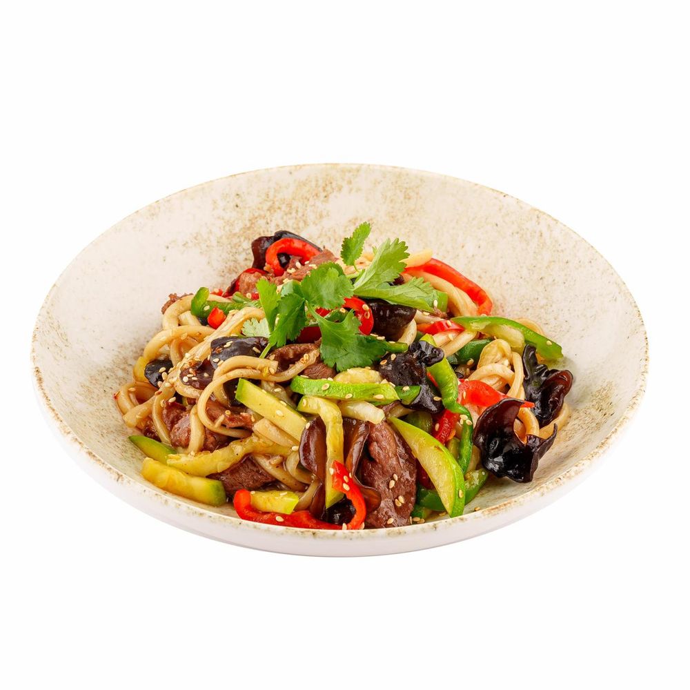 Говядина, лапша, болгарский перец, красный лук, пекинская капуста, кабачки, ростки сои, древесные грибы