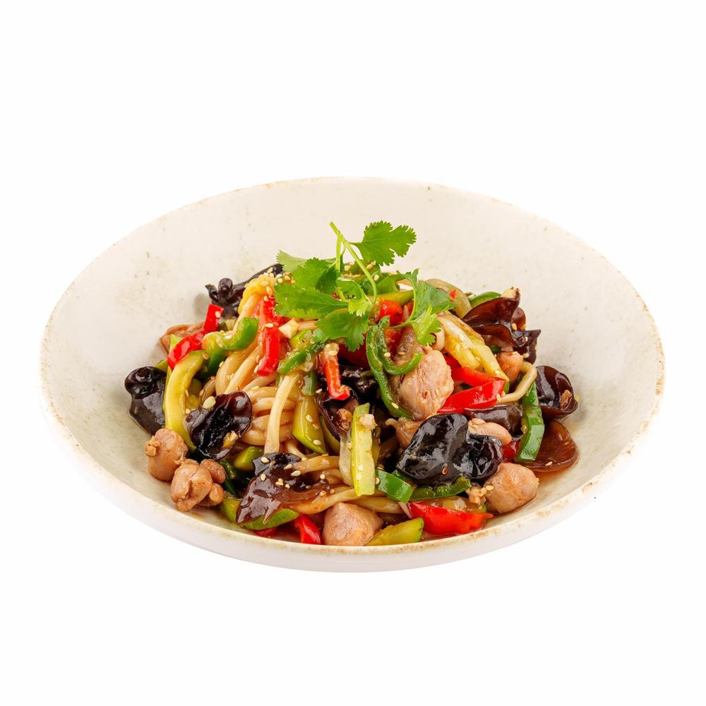 Курица, лапша, болгарский перец, красный лук, пекинская капуста, кабачки, ростки сои, древесные грибы