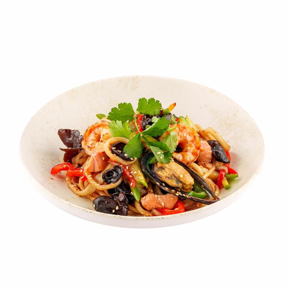 Лосось, креветки, мидии, кальмар, лапша, болгарский перец, красный лук, пекинская капуста, кабачки, ростки сои, древесные грибы