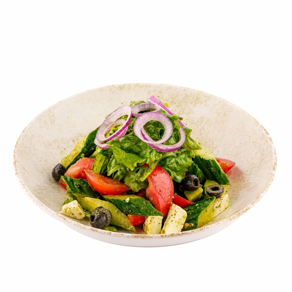 Сыр фетакса , помидоры, листья салата, огурцы, маслины, соус песто , болгарский перец.