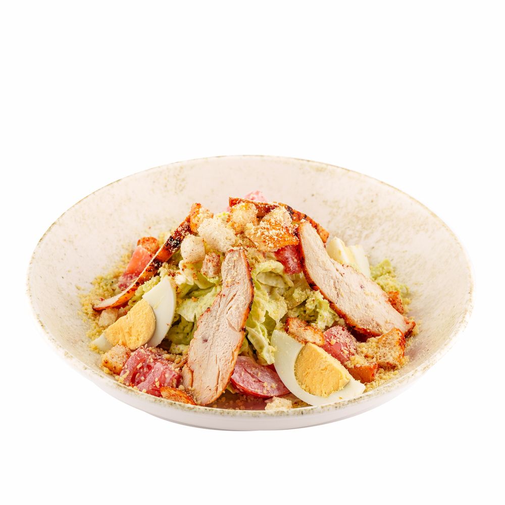 Пекинская капуста, куриное филе, соус цезарь, помидоры, сухари, яйцо, сыр пармезан